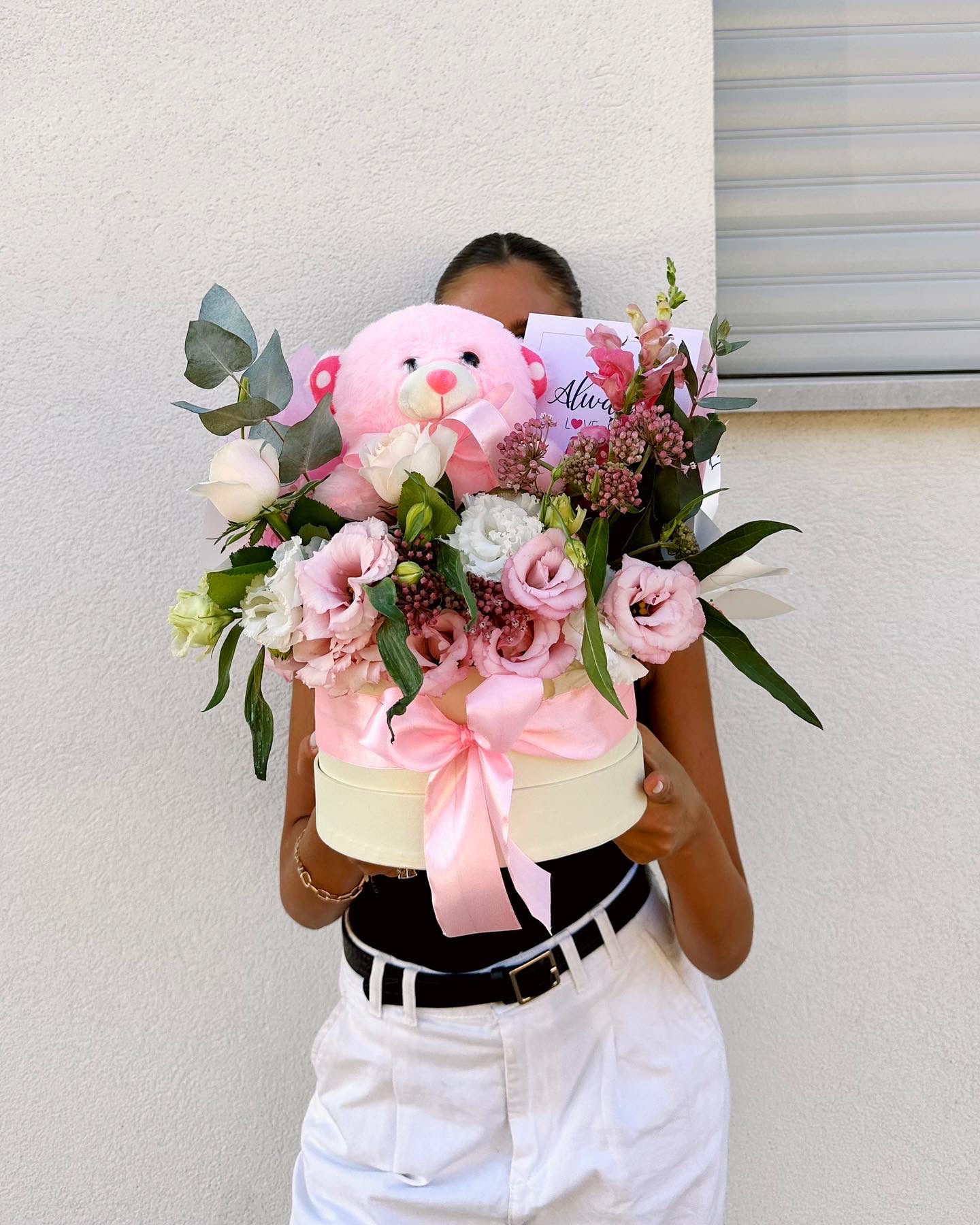 קופסת פרחים עשירה שזורה פרחי העונה בשילוב דובון פרווה ורוד/ לבן