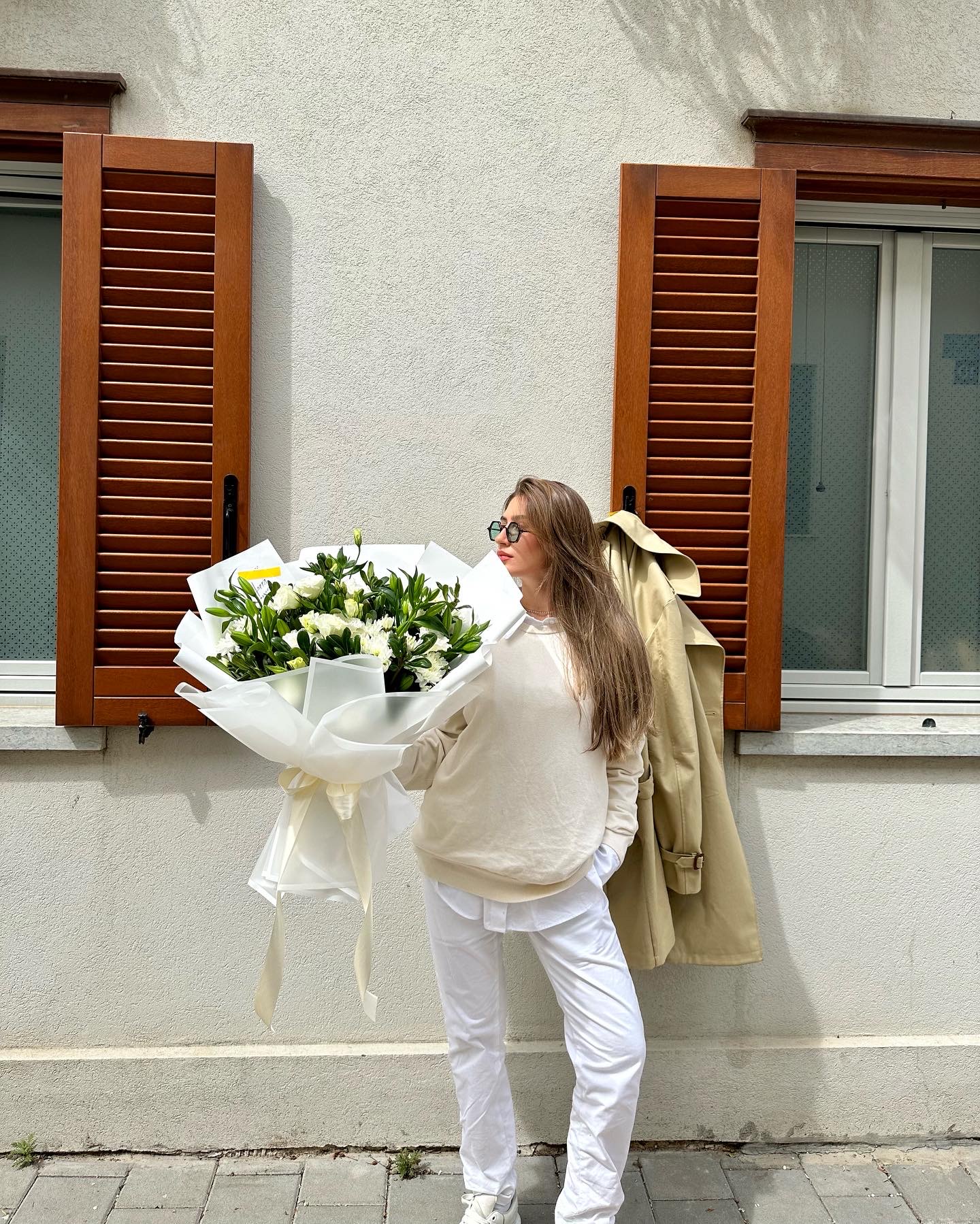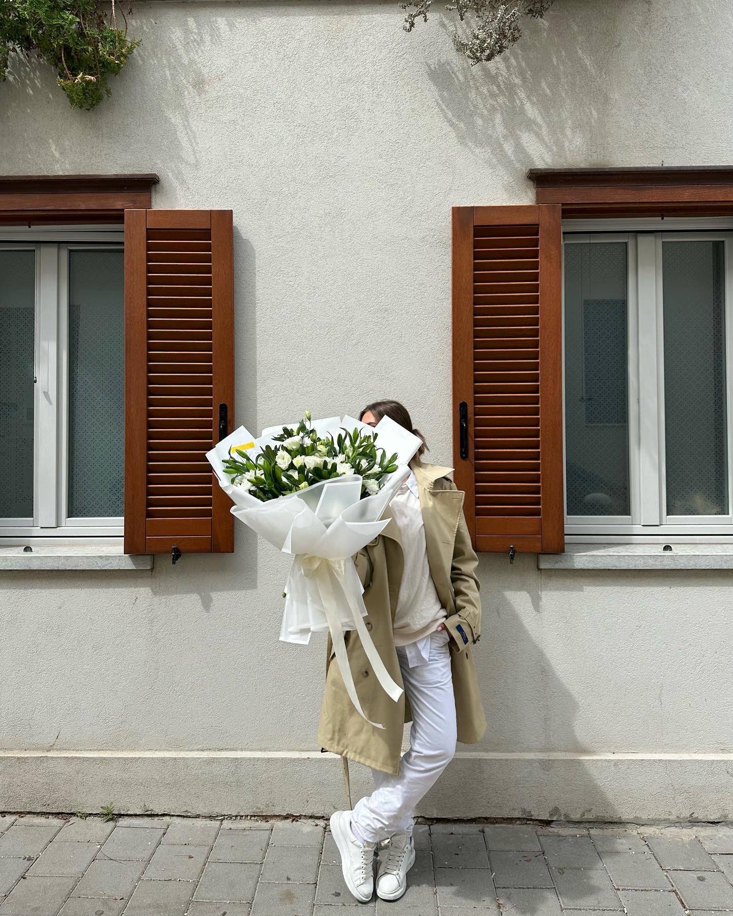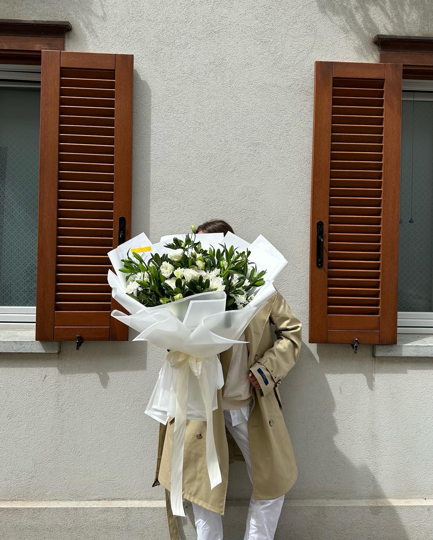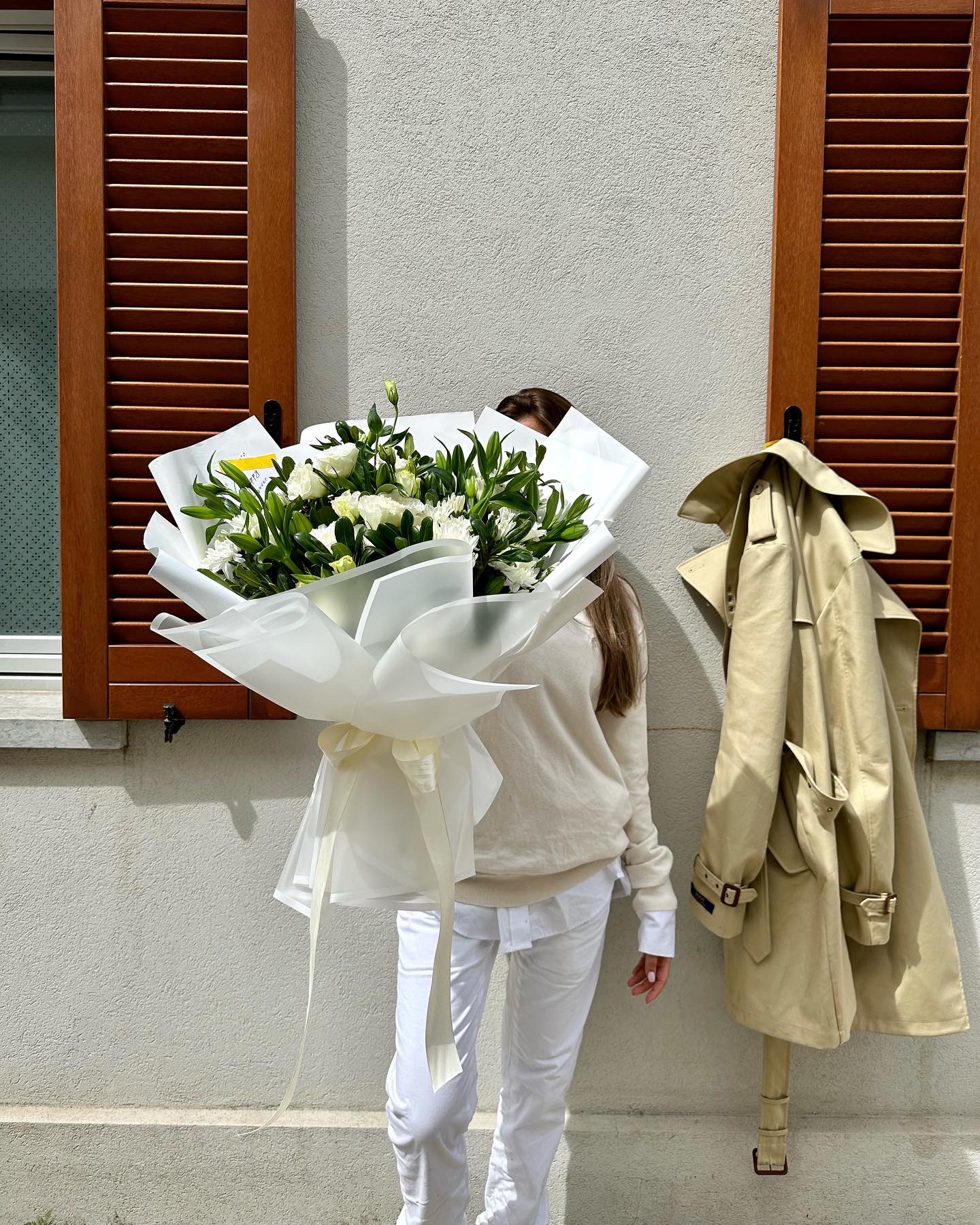 מיקס פרחים של ליליות, ליזיאנטוס וחרציות לבנות בעטיפות לבנות.