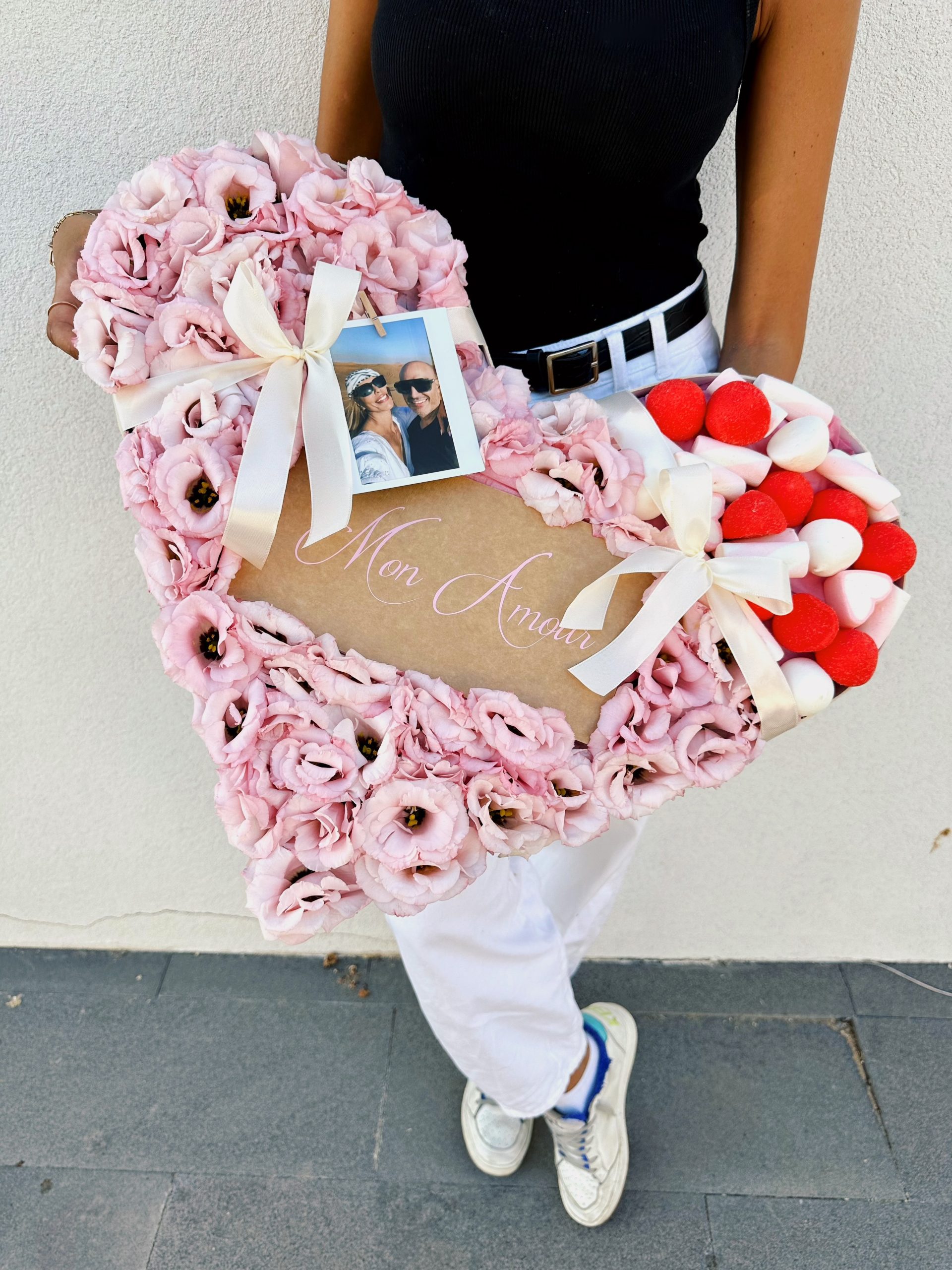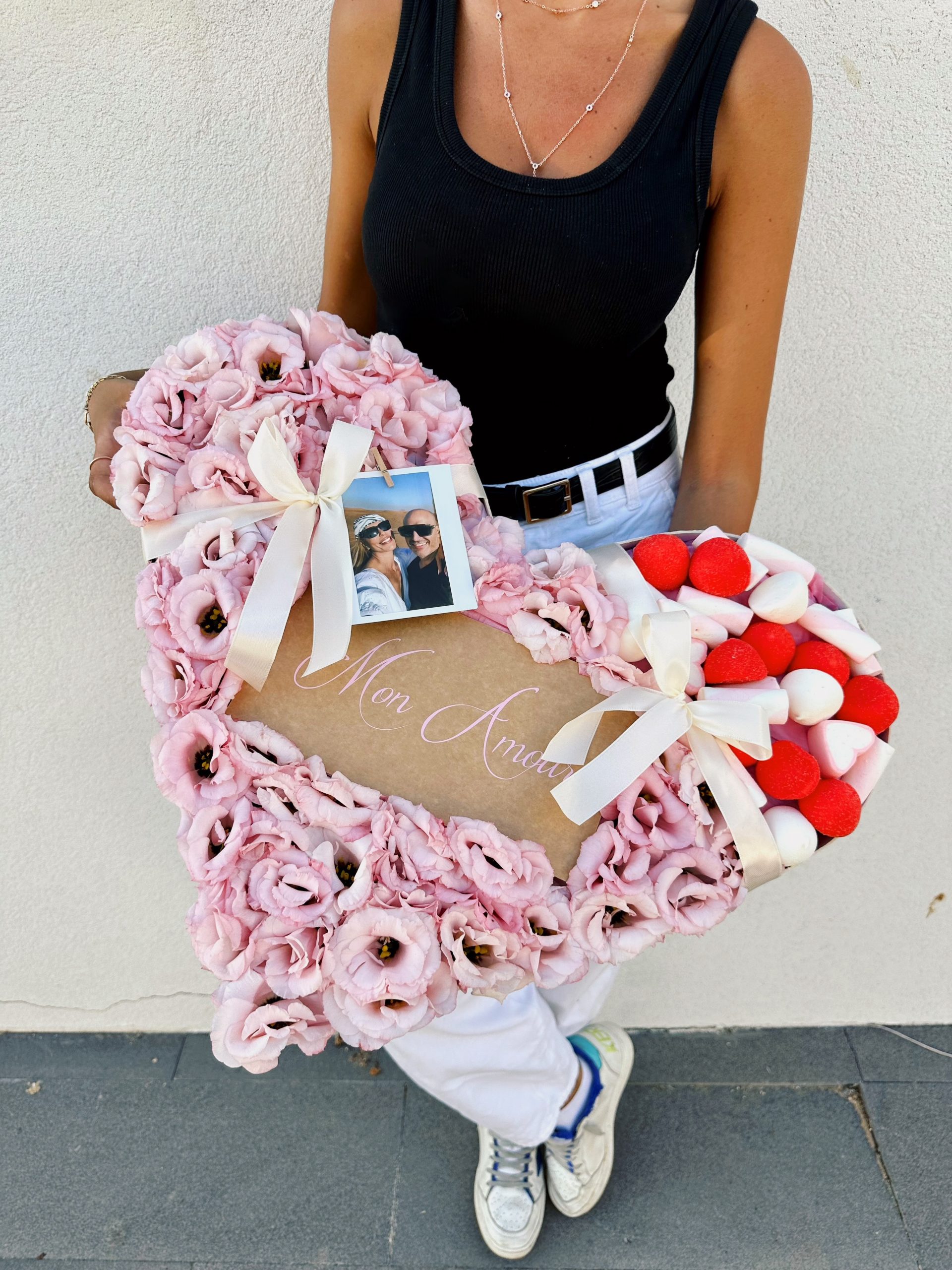 לב ענק שזור פרחים ומתוקים+ מצורפת תמונה אישית לבחירה והקדשה MONAMOUR