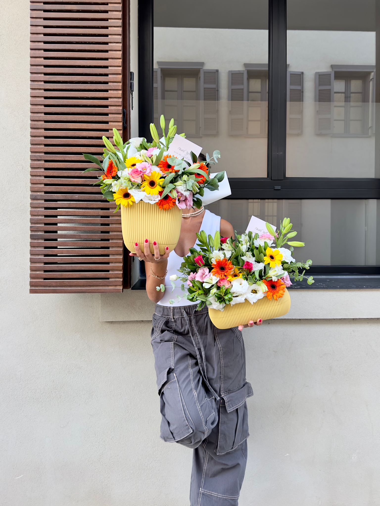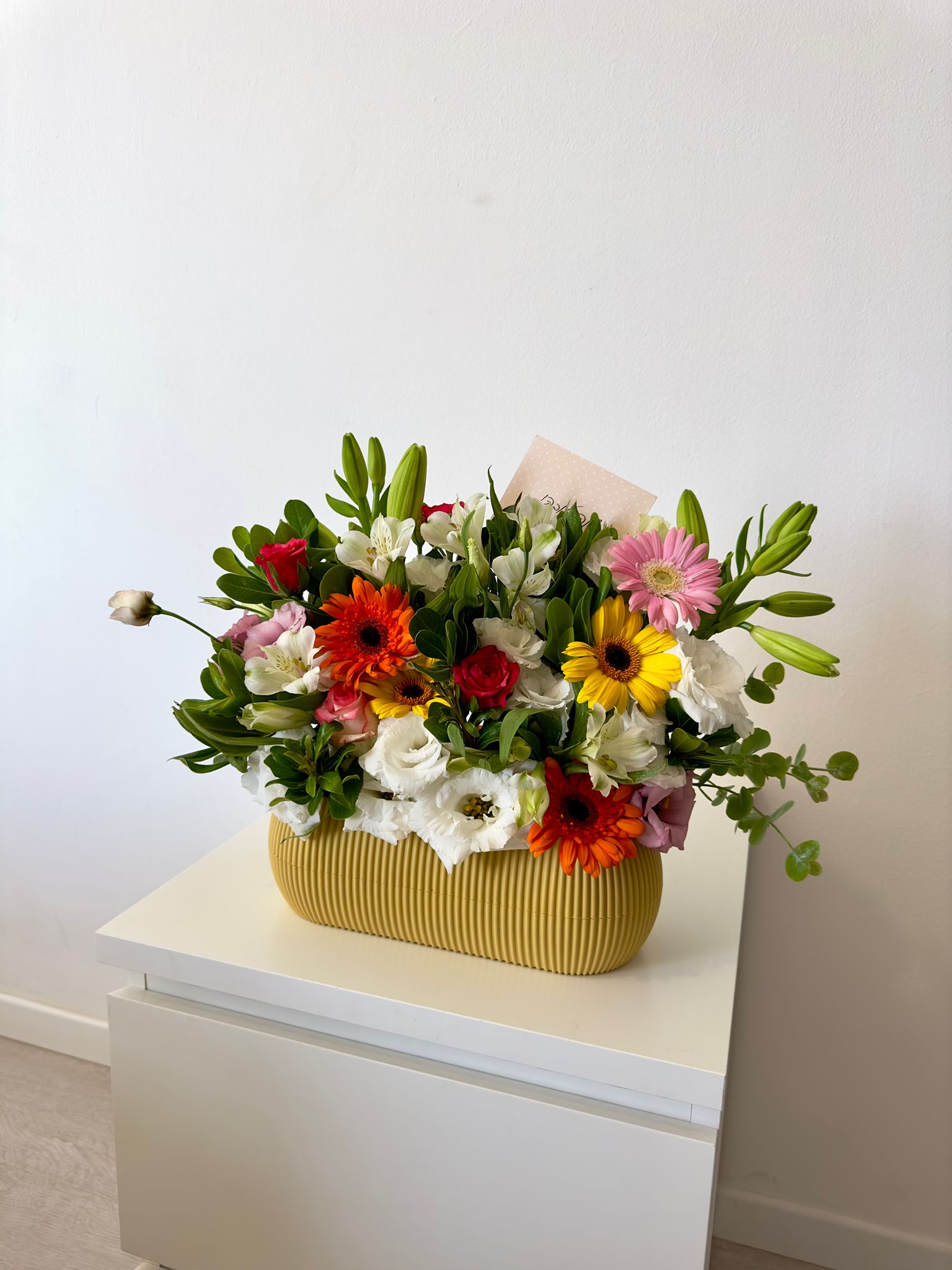 סידור פרחים צבעוני שזור בכלי בטקסטורת פסים.