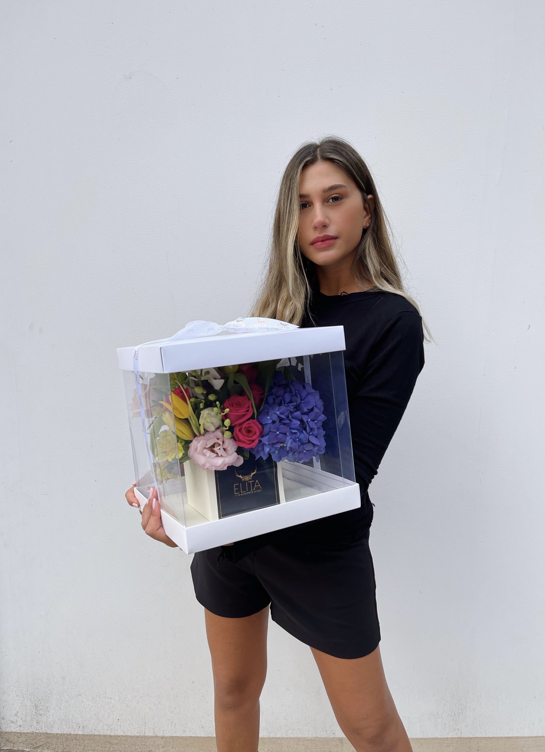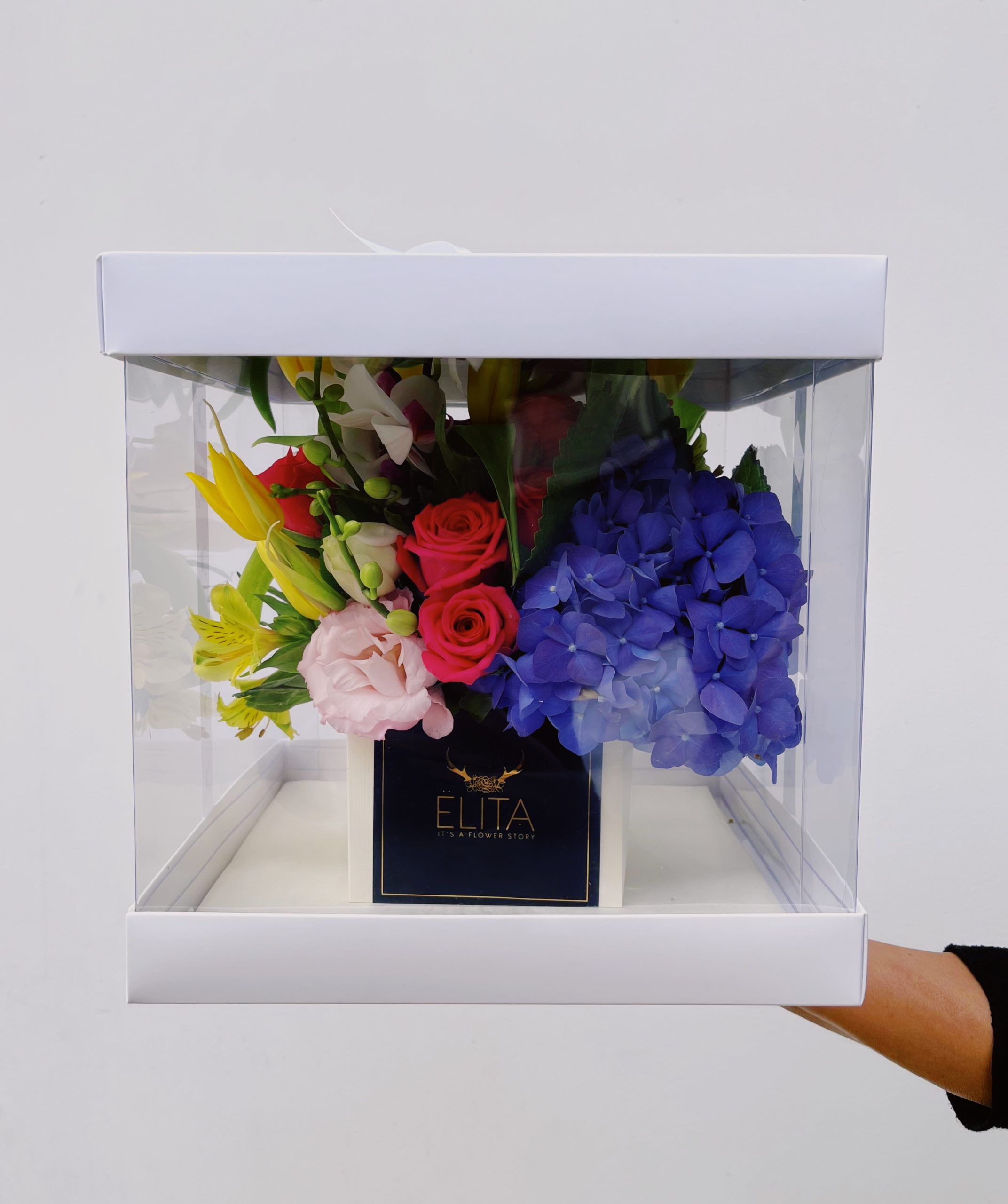 זר בקופסת חלון שקופה שזור פרחי יוקרה. משלב גם הורטנזיות, ורדים, טוליפים, סחלבים וליזיאנטוס.